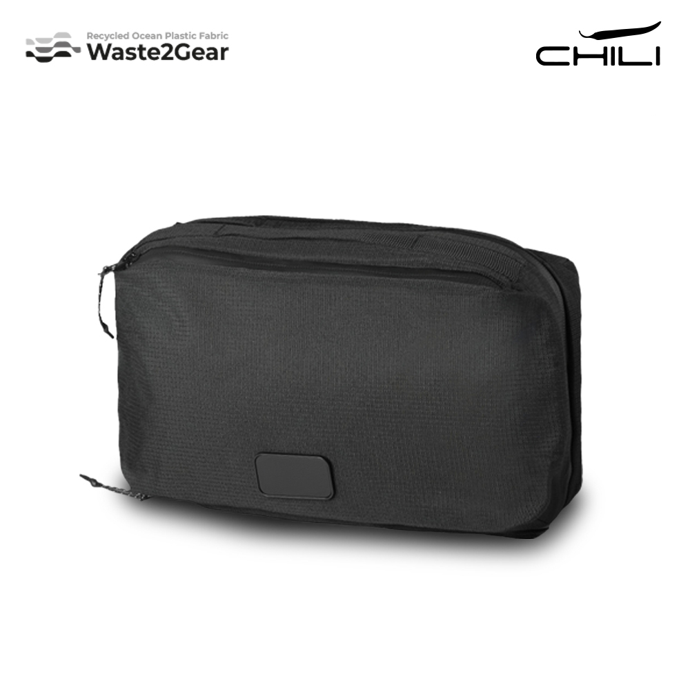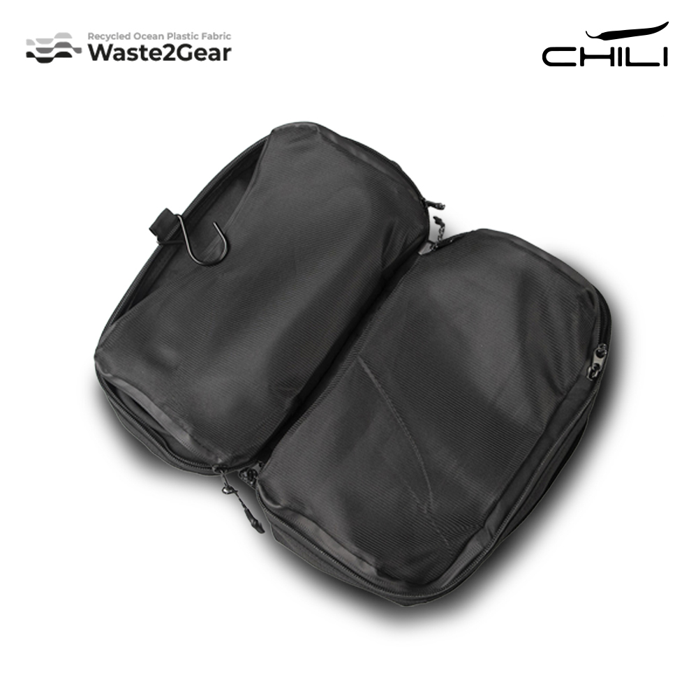Organizador en poliéster reciclado de residuos plásticos recuperados del océano. Dos bolsillos externos con cremallera. Dos bolsillos internos de malla con cremallera. Gancho para colgar.