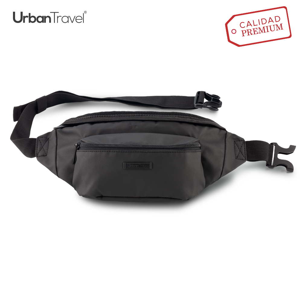 Canguro en poliéster. Dos compartimientos frontales con cremallera y un compartimiento trasero con cremallera. Incluye placa metálica para marcar.