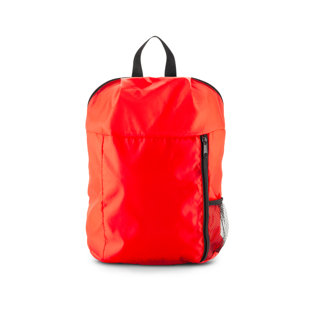 Morral backpack en poliéster. Dos bolsillos externos con cremallera. Un bolsillo lateral en malla.