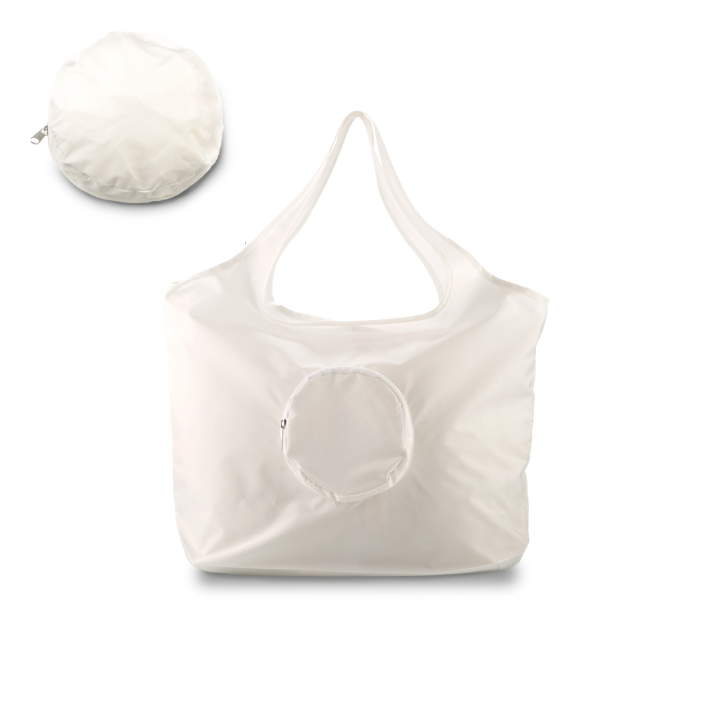 Bolsa compacta en poliéster. Incluye un bolsillo externo con cremallera el cuál funciona como estuche para la bolsa.