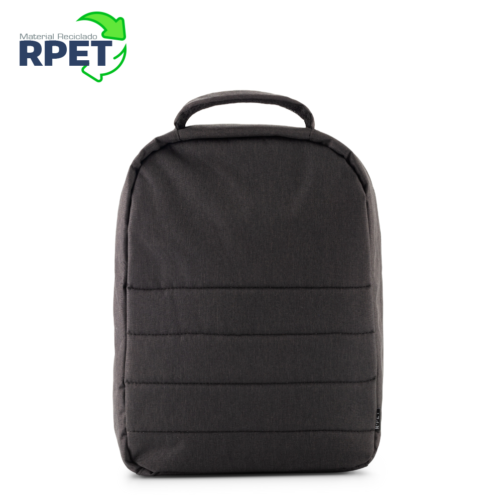 Morral backpack en poliéster reciclado RPET. Apto para portátil de hasta 15″. Banda posterior para enganchar en trolley.