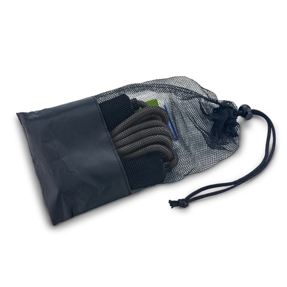 Fitness Set que incluye 2 bandas de 25x5cm en TPE y 1 cuerda de saltar de 260cm. Material: TPE para bandas resistentes de 10 y 15 libras y cuerda PP / EVA / POLIÉSTER. Empacado en bolsa tipo malla en poliéster. Medidas Estuche: 29 cm x 14 cm. Marca: 9 cm / Screen en la bolsa