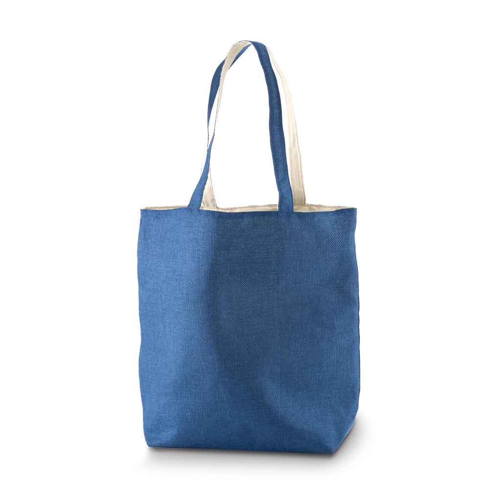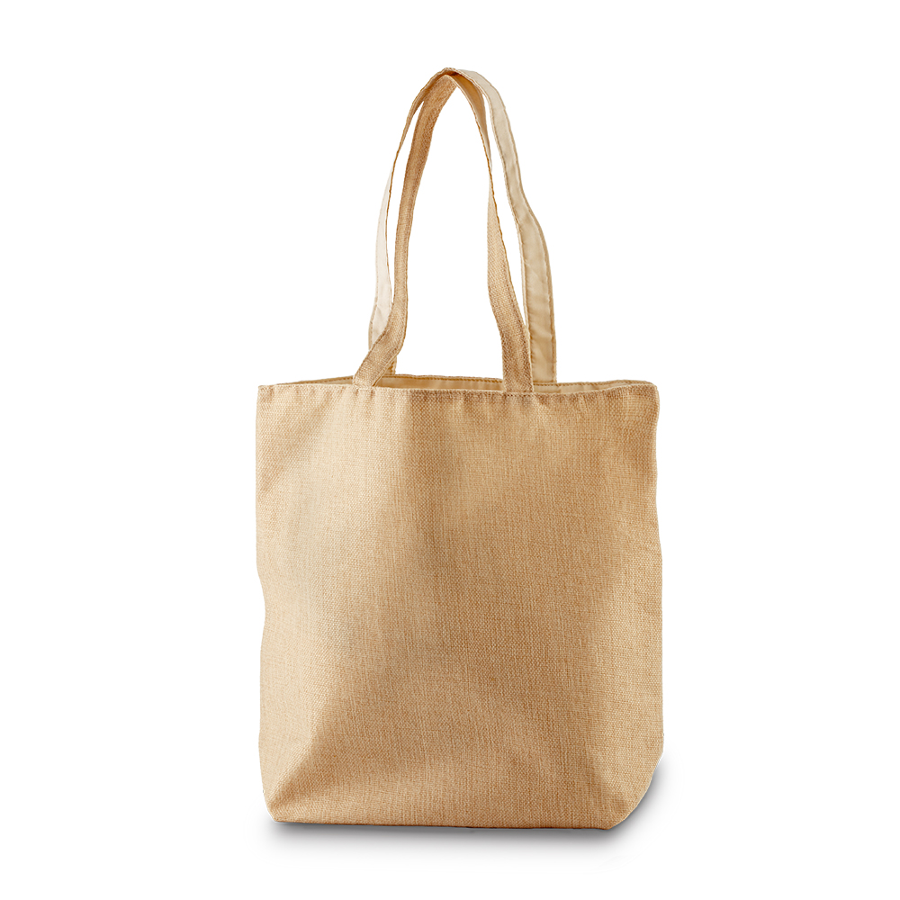 Bolsa en poliéster (imitación yute), con forro en poliéster (imitación algodón). Medidas: 38 cm x 36 cm x 13.5 cm fuelle en la base. Manijas 28 cm largo. Marca: 20 cm / Screen