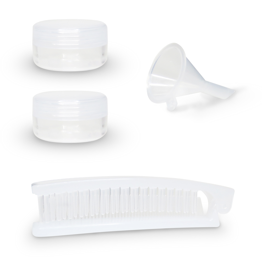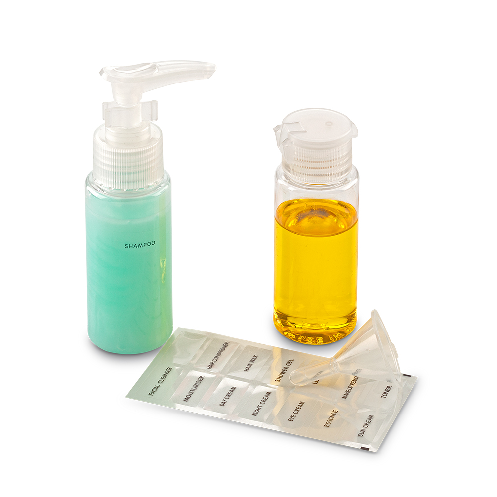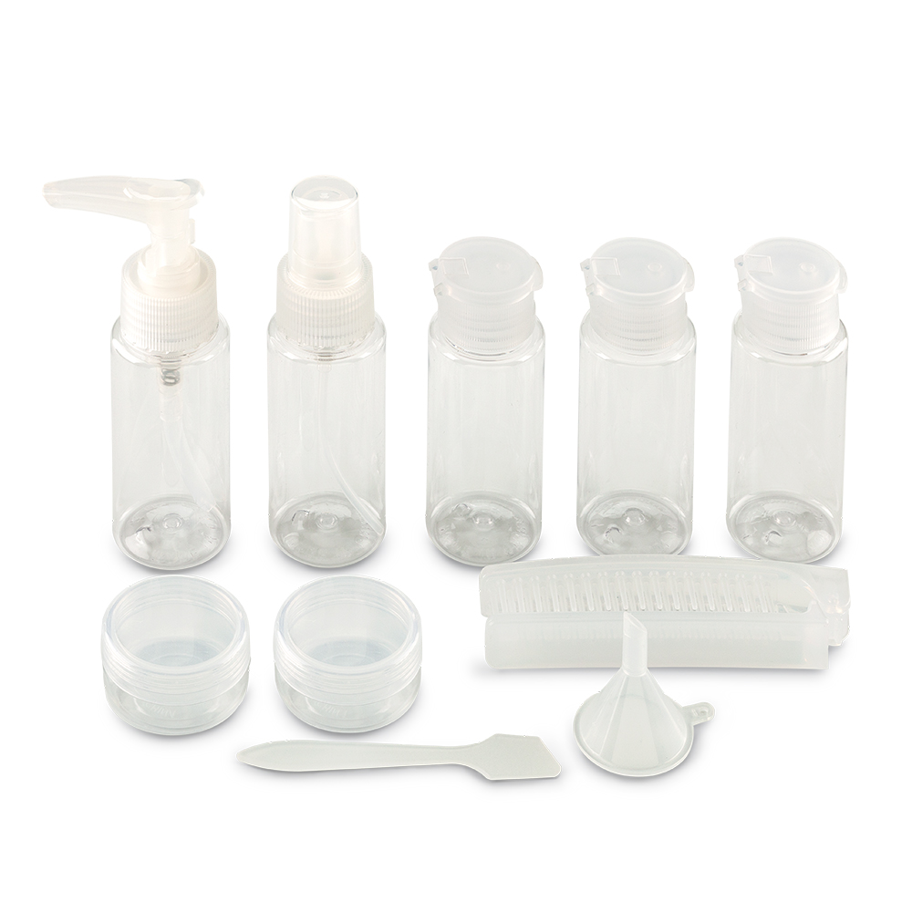 Set de 11 piezas plásticas para viaje: 3 frascos con tapa abatible (500 ml), 1 frasco dosificador (50 ml), 1 frasco tapa spray (50 ml), 2 tarros de crema (10 ml), 1 peine, 1 embudo, 1 espátula, identificadores adhesivos.