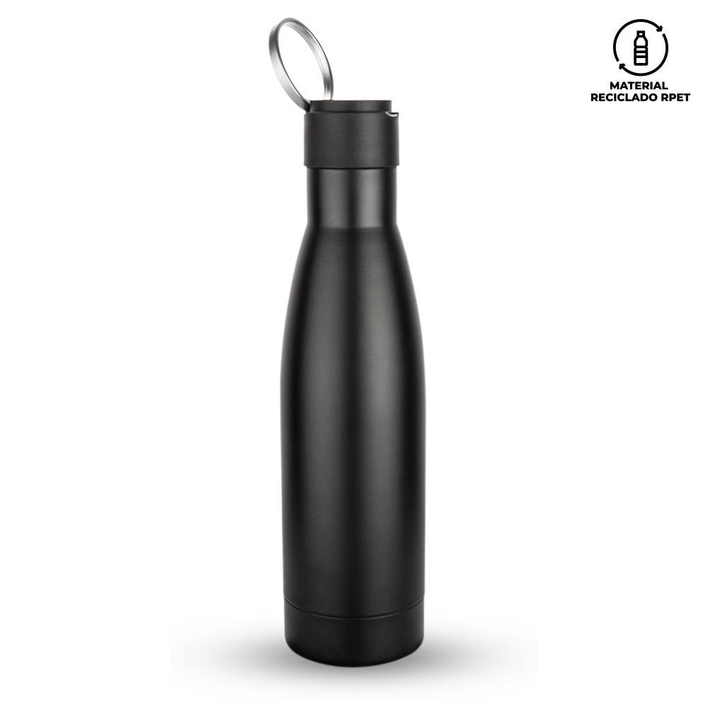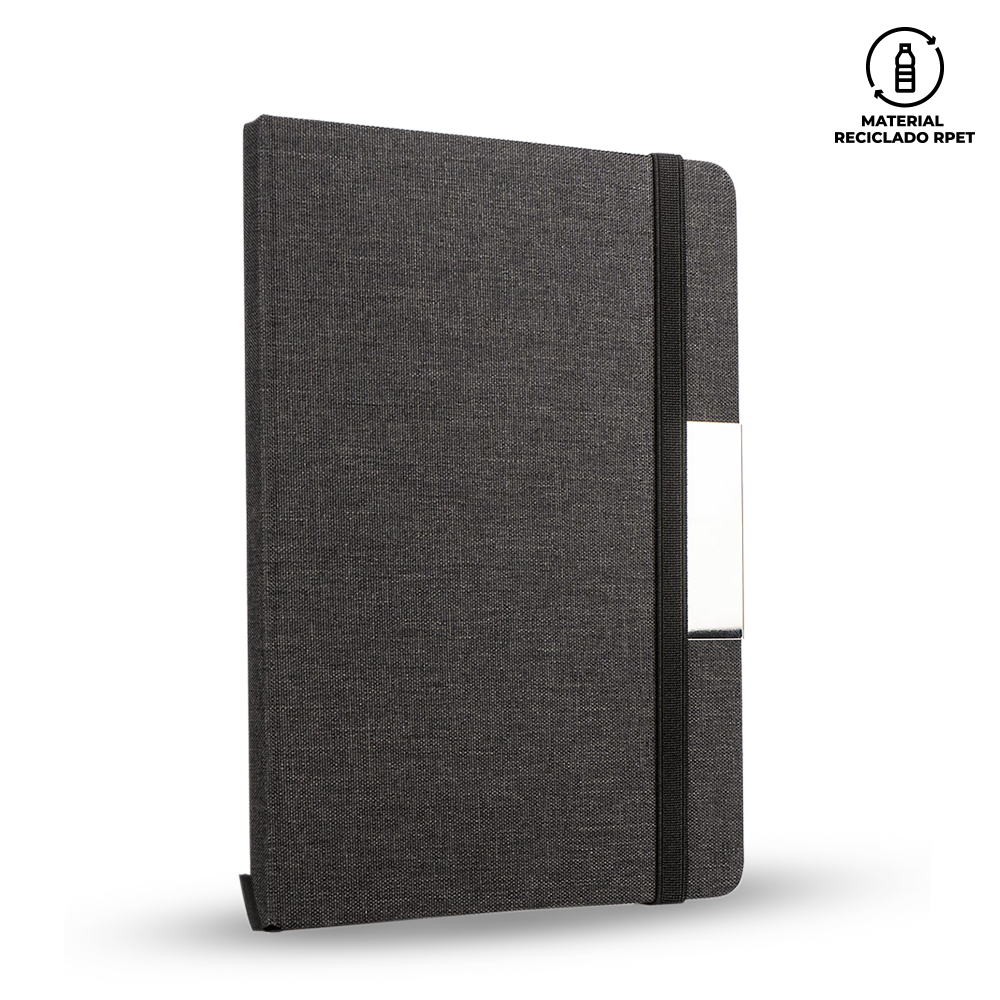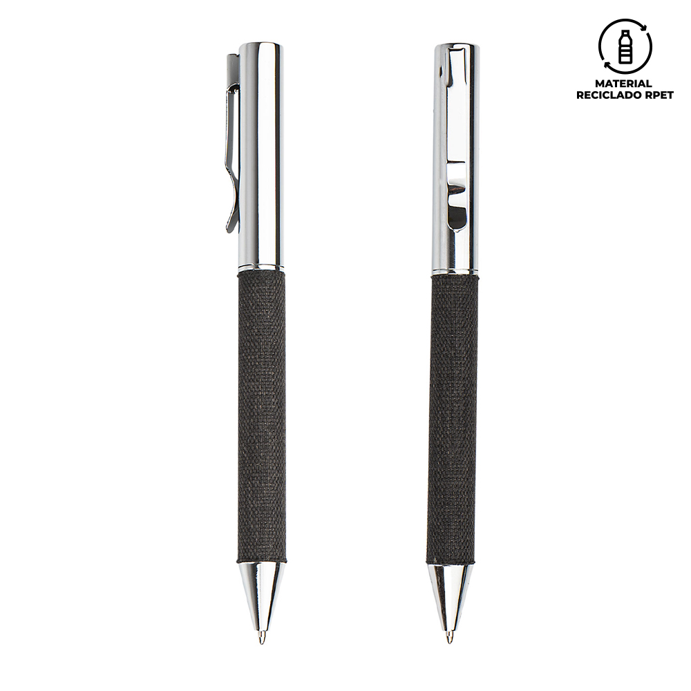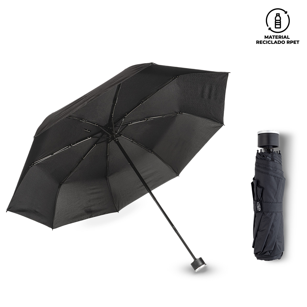 Set en estuche de lujo que incluye bolígrafo en aluminio con cubierta RPET y sistema twist, libreta con cubierta RPET con 80 hojas rayadas, banda elástica de cierre lateral, cinta separadora y portabolígrafo. Adicionalmente, un mini paraguas de tela 190t Pongee y un botilito de 600ml doble pared en acero inoxidable con tapa de rosca y aro metálico. Empaque caja individual.