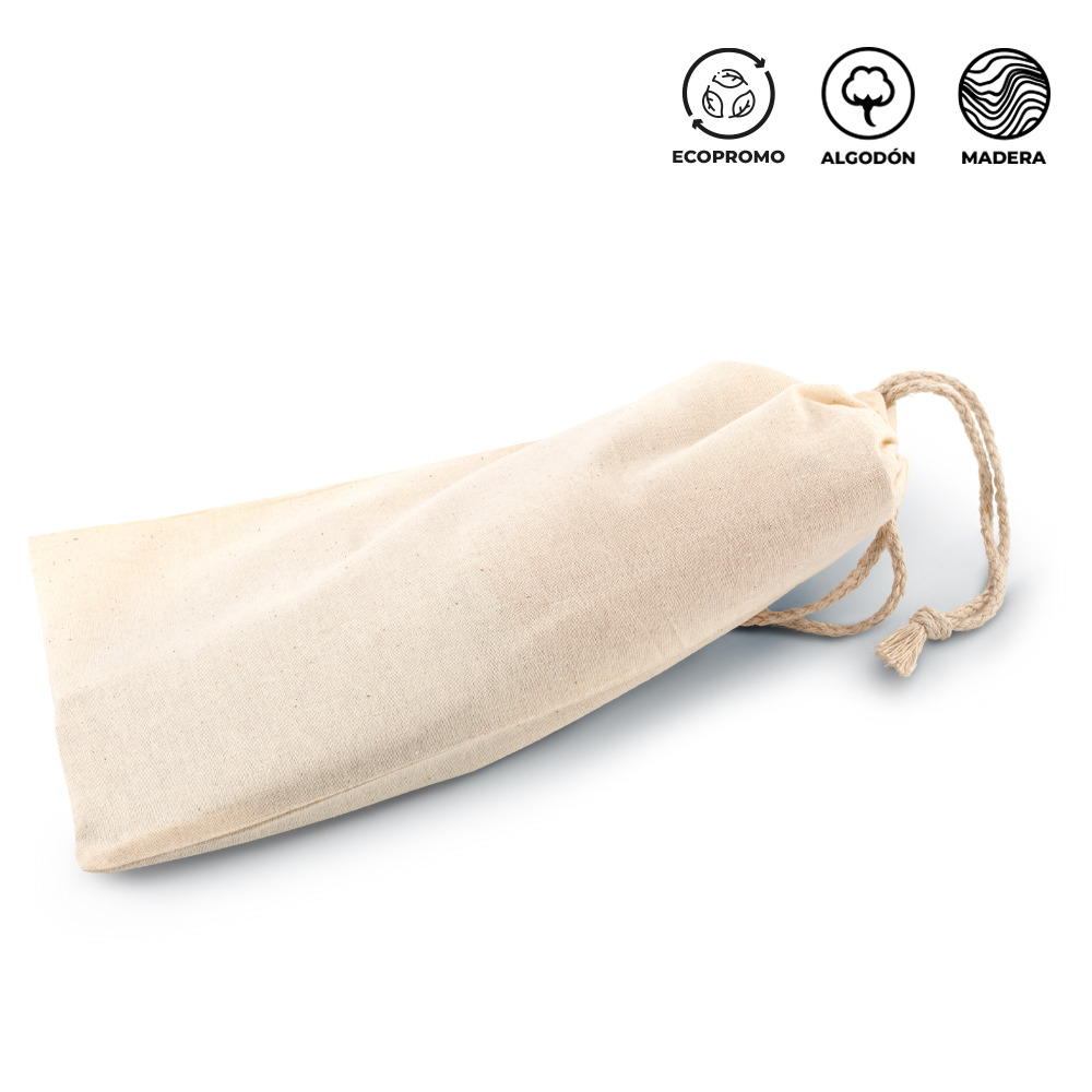 Set de cocina en madera con bolsa de algodón. Tres accesorios con mango de madera (cortador de pizza, pala y rallador de queso).