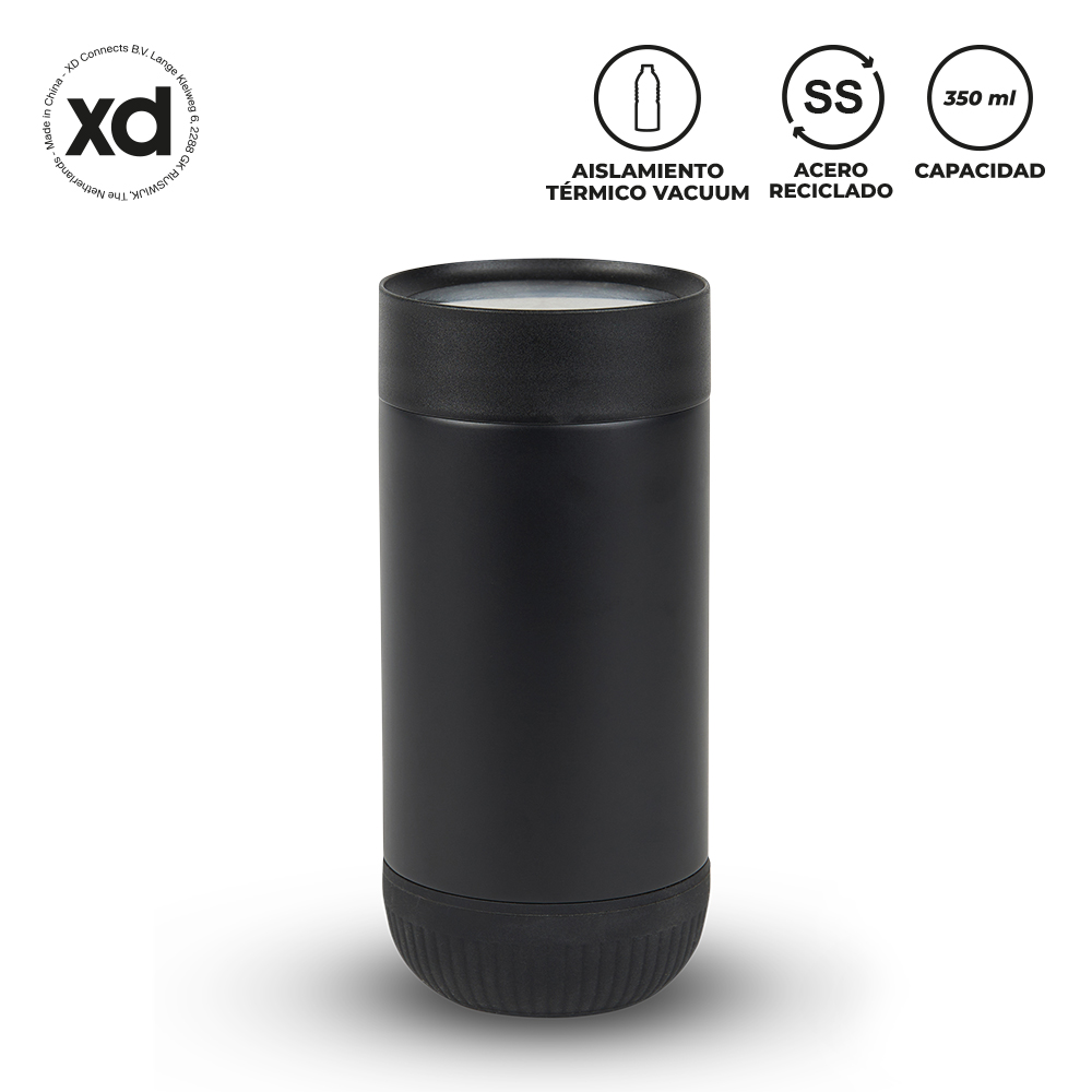 Mug doble pared vacuum en acero inoxidable reciclado, con aislamiento térmico que mantiene la bebida fría entre 8-10h aprox o caliente 3-4h aprox (puede variar dependiendo las condiciones climáticas). Tapa rosca push y base en caucho.