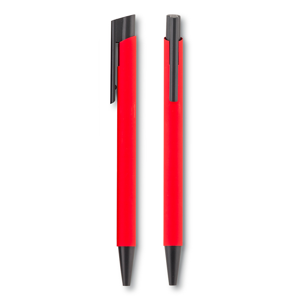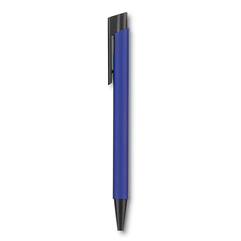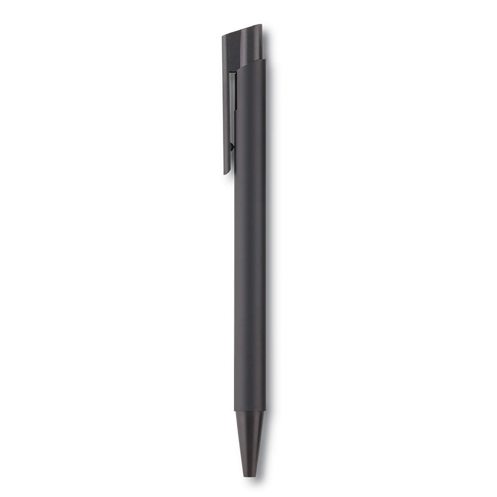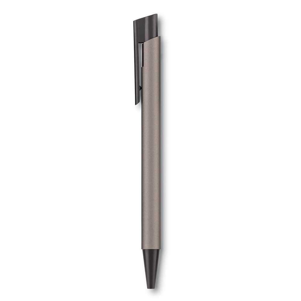Bolígrafo metálico con mecanismo push y clip plástico.