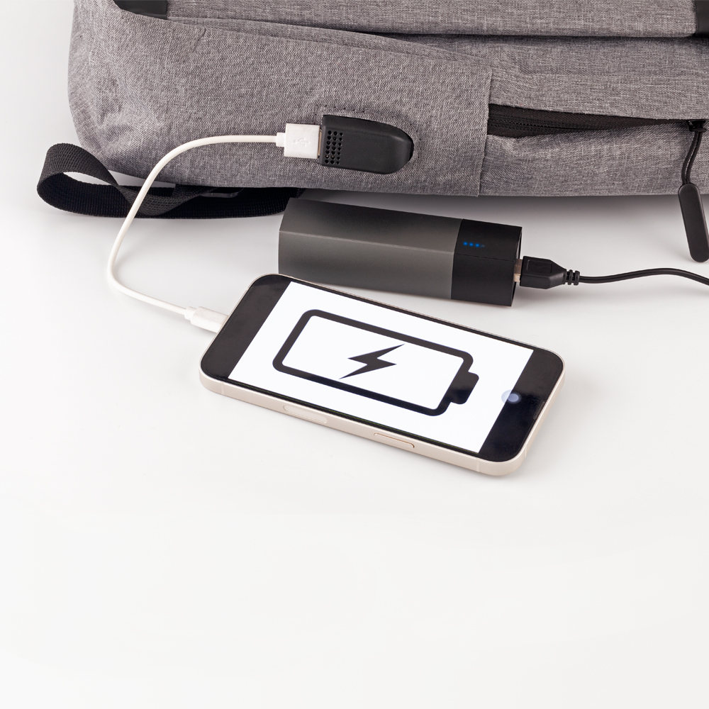con cremallera, capacidad para portátil de hasta 15”y puerto USB para carga desde el interior (no incluye