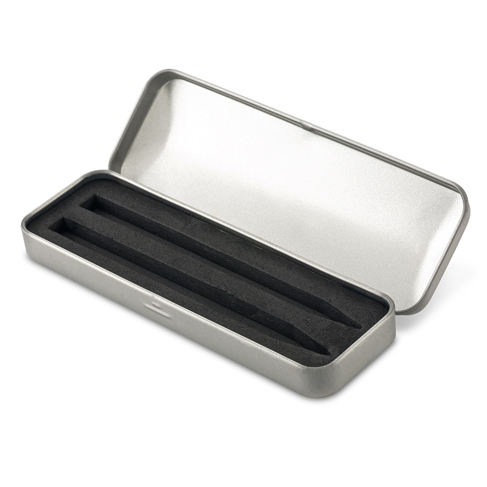 Estuche metálico. Opción espuma EVA con compartimiento para 1 o 2 bolígrafos.