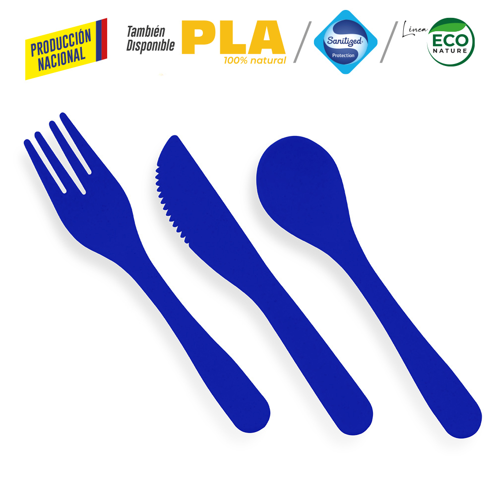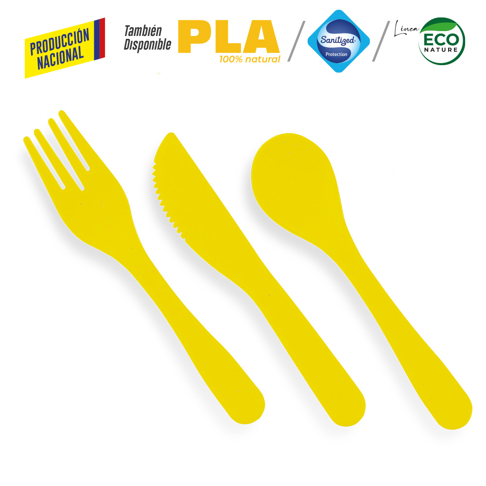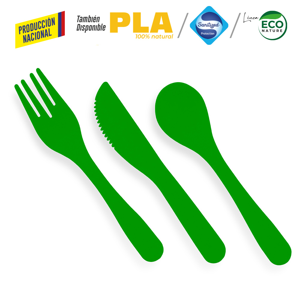 En plástico, incluye cuchara, tenedor y cuchillo. Se vende por set.