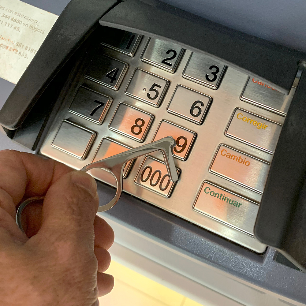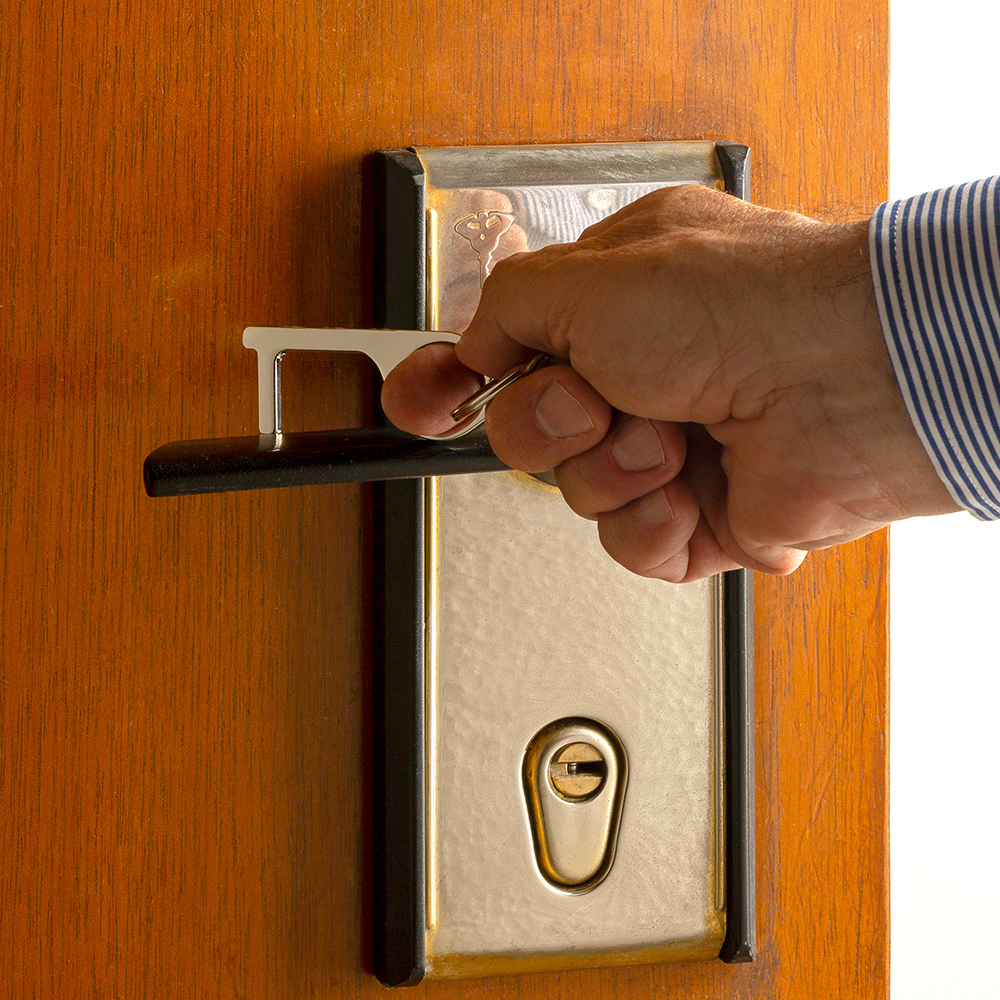 Llavero en Aleación de Zinc con recubrimiento plateado. Diseño ergonómico que permite fácilmente abrir puertas, presionar botones, halar palancas. Reduce la contaminación y la exposición de los dedos a superficies y reduce el área de contacto hasta en 99%.
