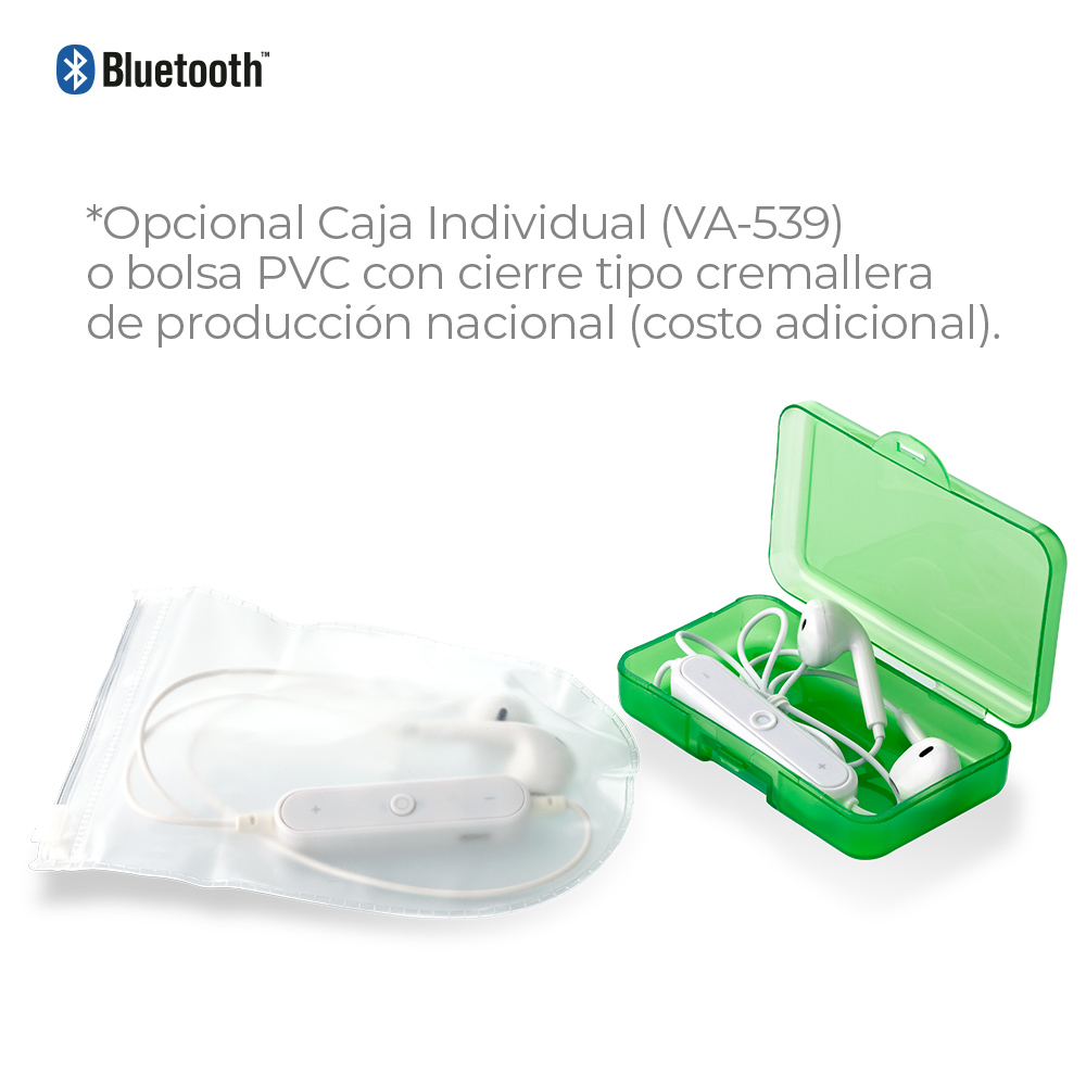 Audífonos Bluetooth plásticos intraauriculares con control de volumen. Capacidad de la batería interna 55mAh. Tiempo de carga 1.5h aprox. Tiempo de reproducción 2-3h aprox. Funciona como manos libres. Empaque Bolsa plástica.