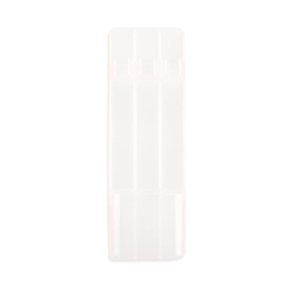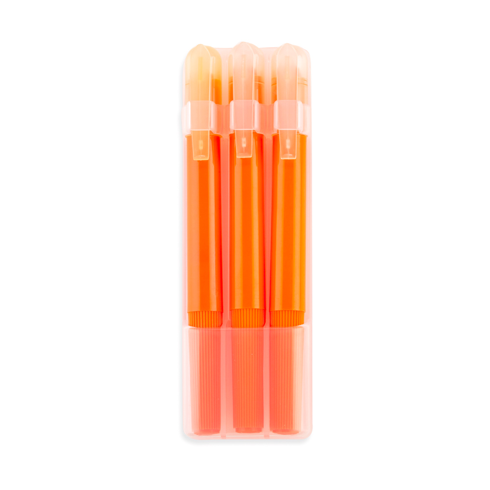 En plástico. Estuche para 3 resaltadores. Los colores de los resaltadores son opcionales.