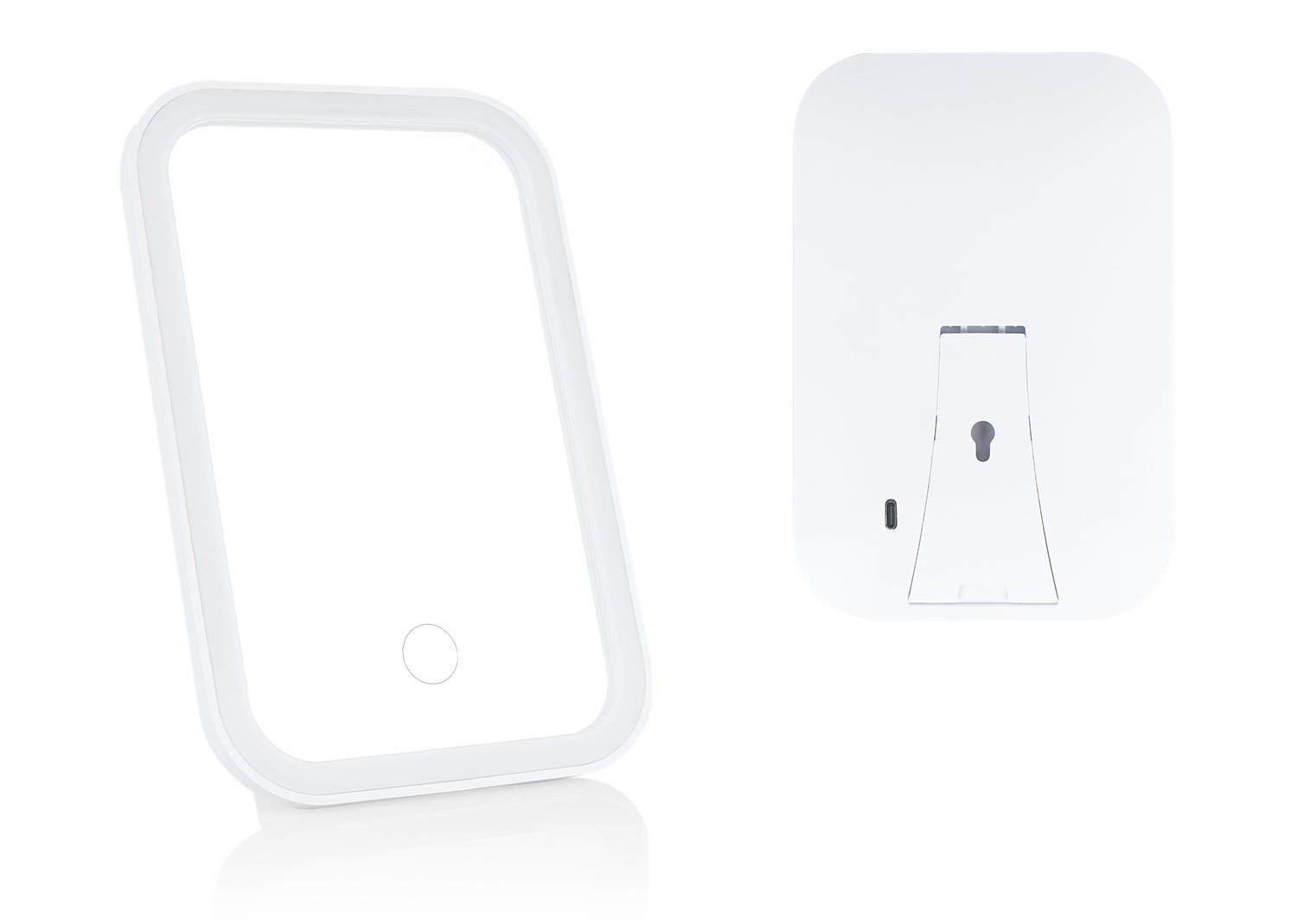 Espejo para tocador o para viaje con luz led incluida. Soporte para mesa y orificio que permite colgarlo. Permite ajustar el brillo según la necesidad.