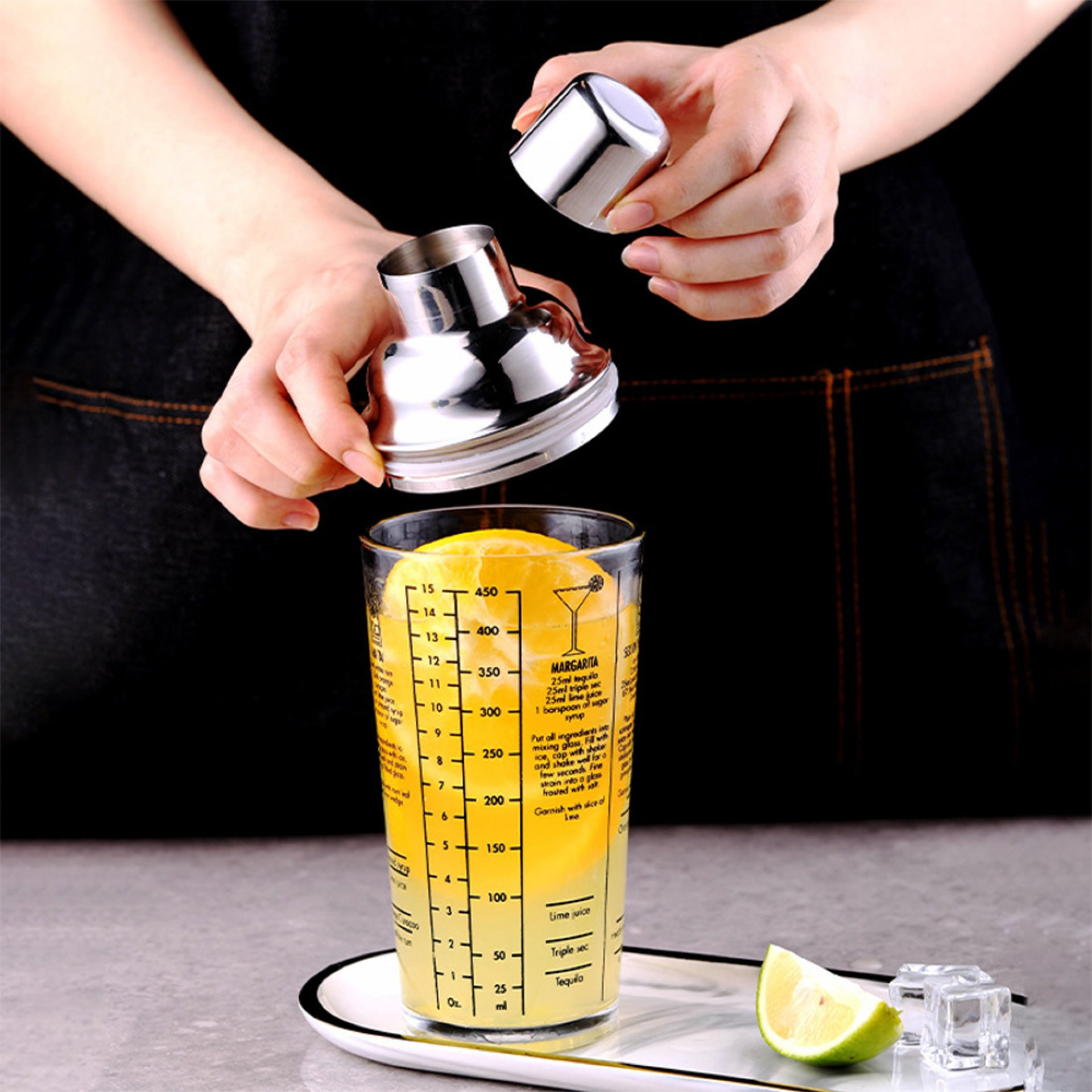 Mezclador de 400 ml con recetas para cocteles en vidrio y tapa en acero inoxidable.
