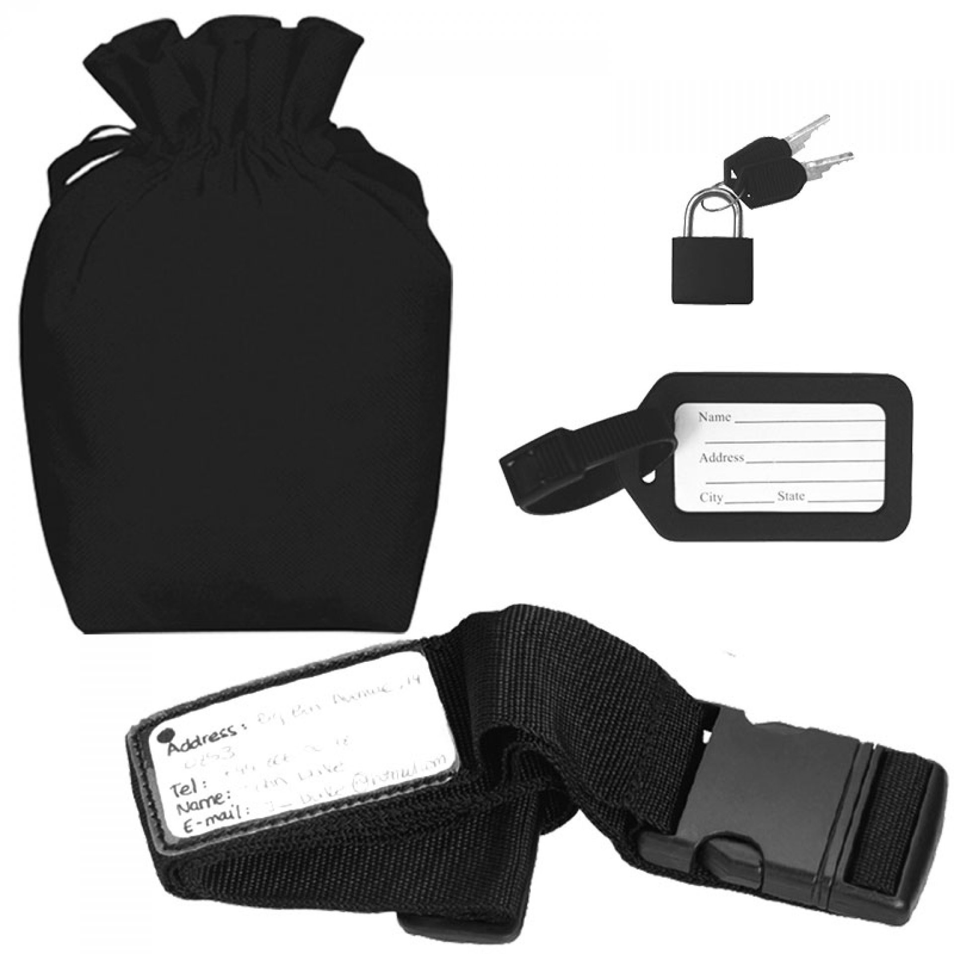 Incluye: Identificador de equipaje, candado universal y reata para maletas. De: 12 x 10 cm.