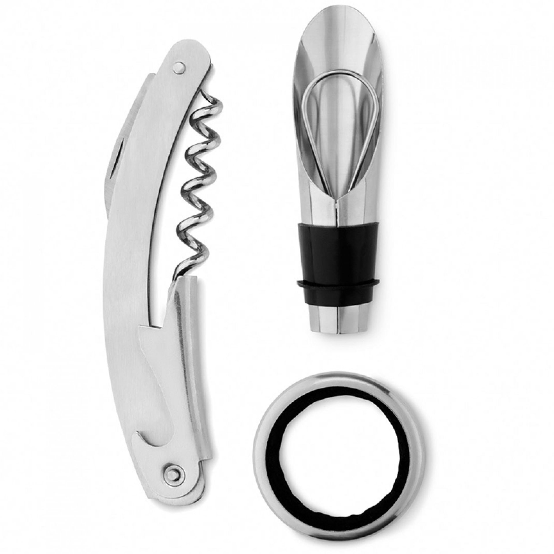 Set de vino 3 piezas. Incluye: Saca corcho con destapador y navaja, argolla anti goteo y dosificador Metálicos. De: 23,2 x 9 x 9 cm.
