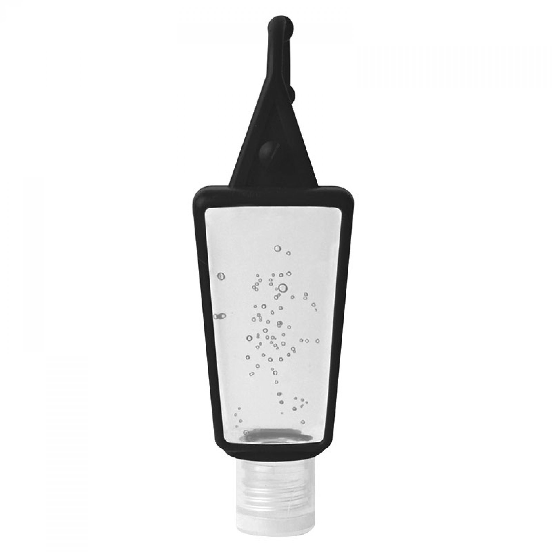 Recipiente plástico con gel antibacterial y estuche siliconado para colgar. 30 ml. De: 7,8 x 3,5 cm.