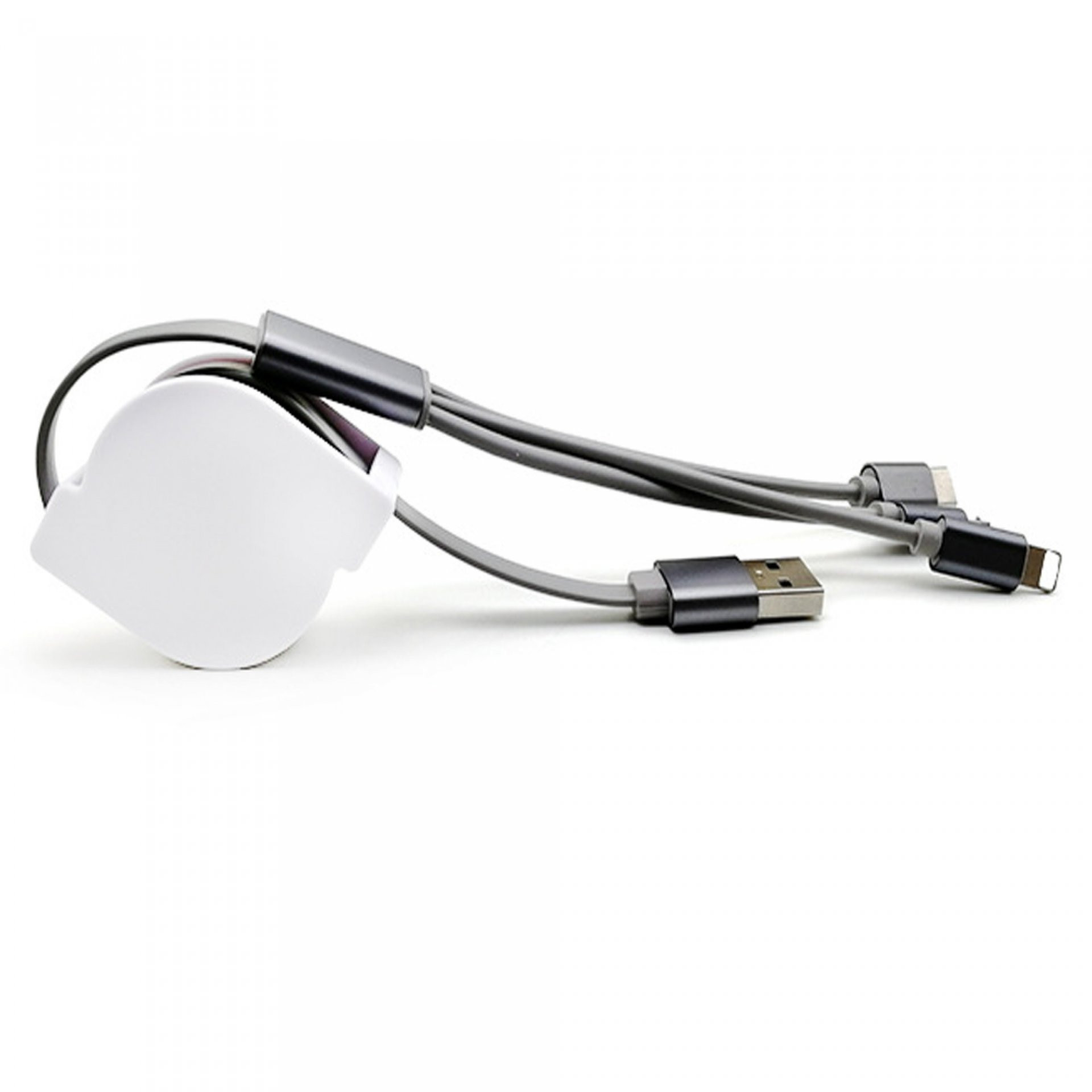 Set de carga 3 en 1. Cable extensor retrÁctil de 1 metro. Cargador Lightning (Apple), Micro USB y tipo C de carga rÁpida. Cuerpo blanco