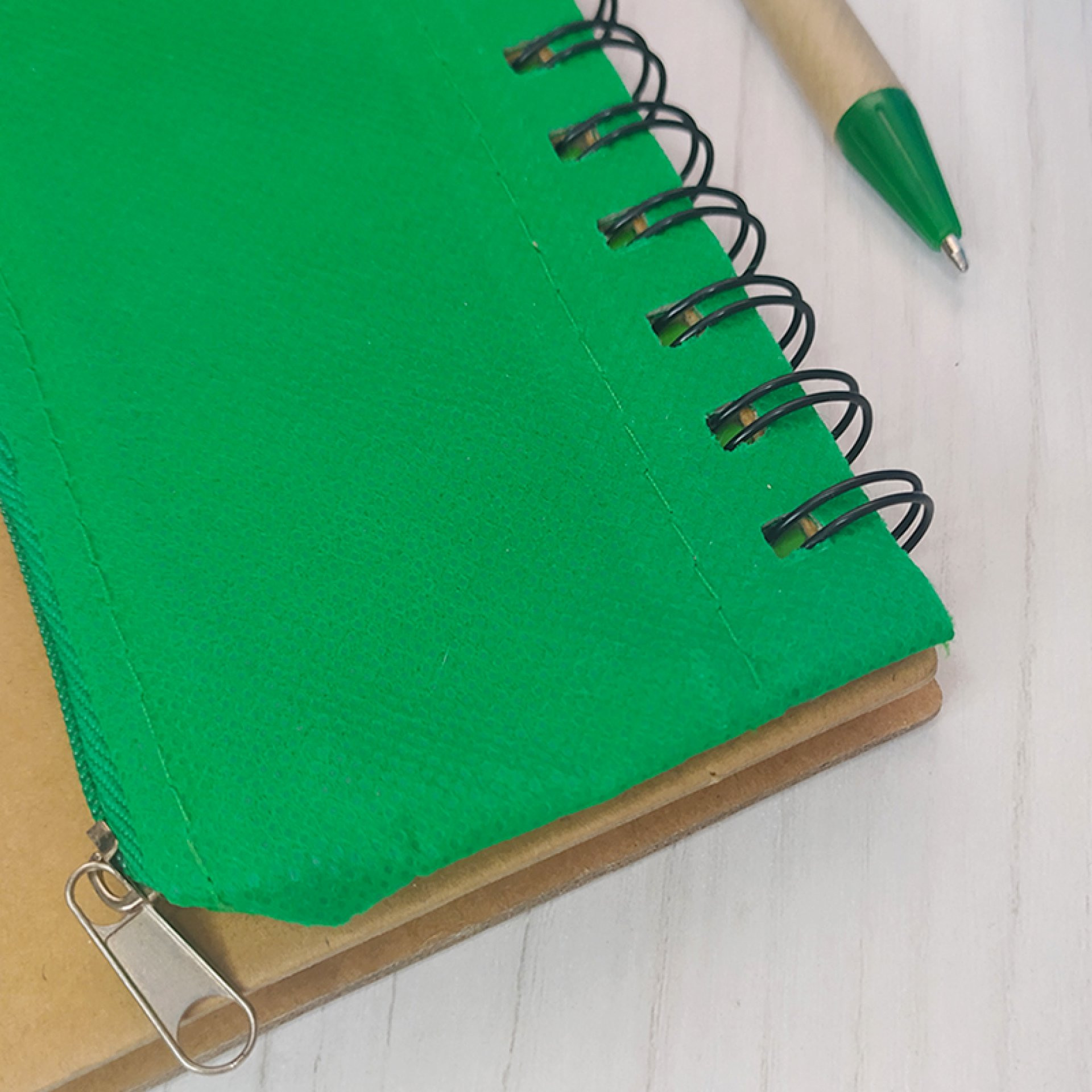 Tapas de cartón ecológico gruesas, 80 hojas. Cartuchera en cambrel con cremallera. Bolígrafo de cartón. De 14.5 x 18 cm.