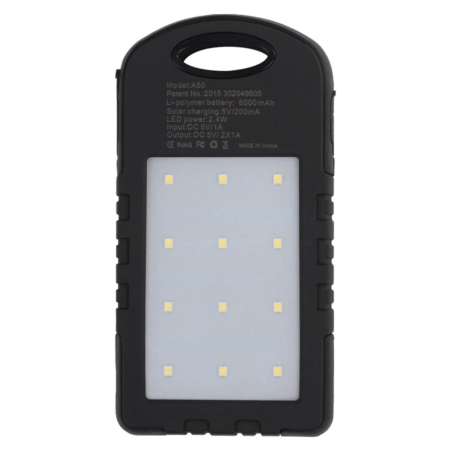 Batería recargable externa de 4000 mAh. Con panel para carga directa de luz solar (hasta un 15%), linterna de 12 leds y luz UV morada. Resistente a salpicaduras de agua, anti polvo y anti golpes. Doble entrada USB. Con indicador de carga. De 7,5 cm x 14,5 cm x 1,5 cm.