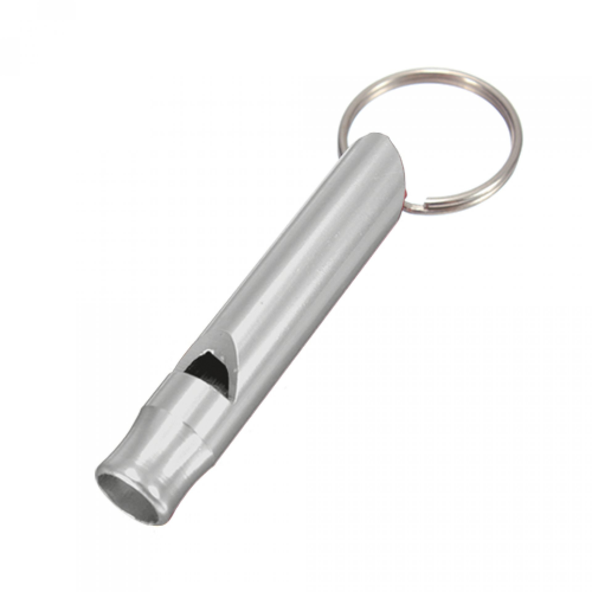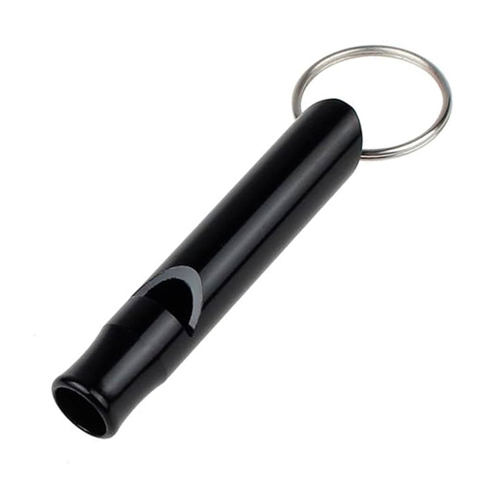 Metálico con silbato. De 8.5 cm de largo incluyendo argolla.
