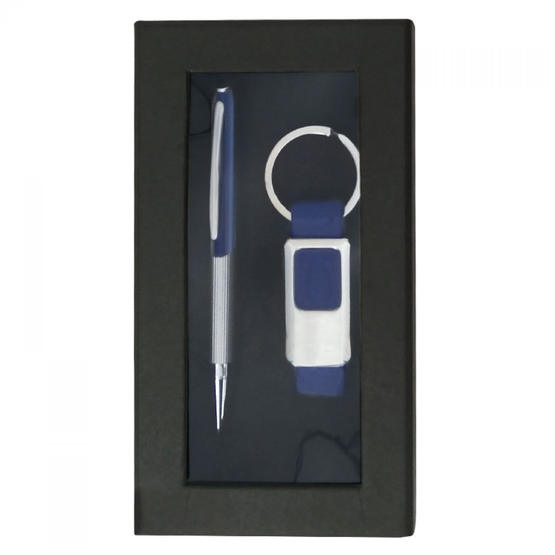 Set en caja de cartón con venata que incluye llavero metálico con accesorio en imitación cuero y bolígrafo metálico.