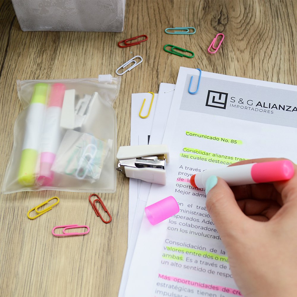 2 resaltadores de cera talla L, cosedora plástica, clips multicolores en bolsa PVC de cremallera plástica. Resaltador: 8.8 x 1.4 cm. Bolsa: 10.5 x 8.5 cm.