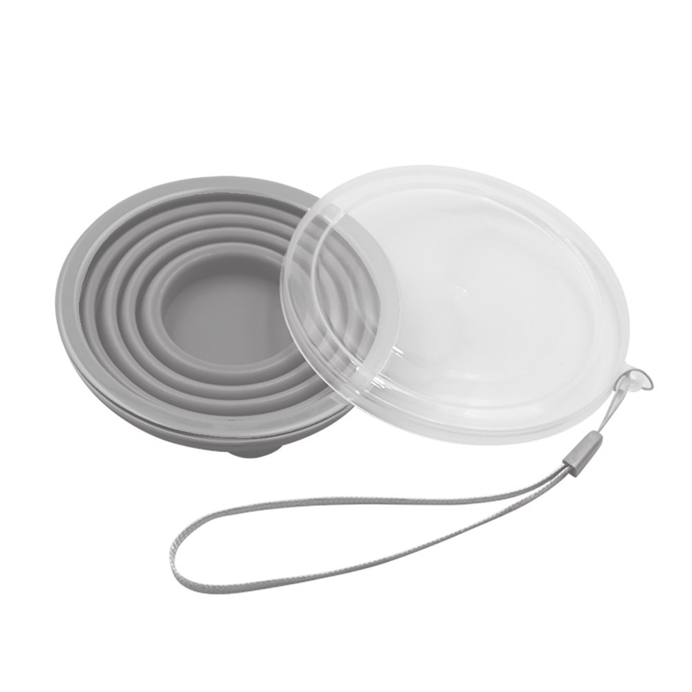 Vaso en silicona de grado alimenticio plegable en 4 cuerposcon tapa removible. Cordón para colgar. Capadidad 200 ml. De 8.3 x 8.6cm de diámetro.