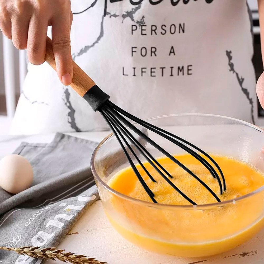Mango en madera y batidor en silicona de grado alimenticio. De 30 x 6.5 cm