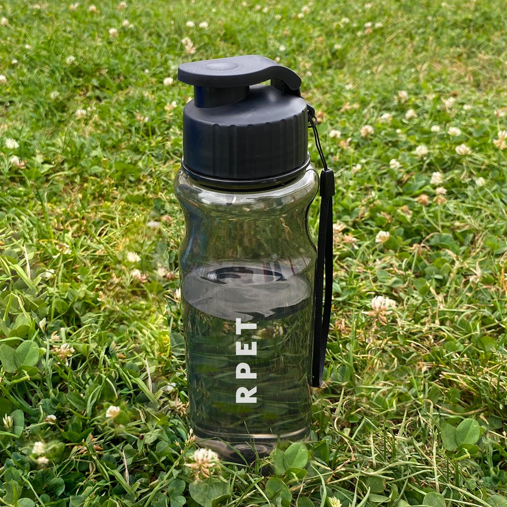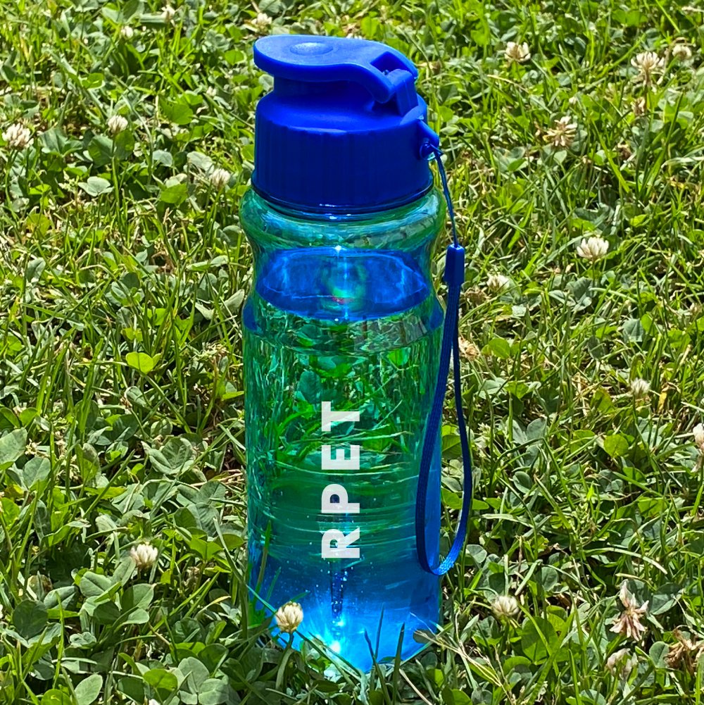 Elaborada en RPET. Capaciadd de 680 ml. Cordón para colgar.