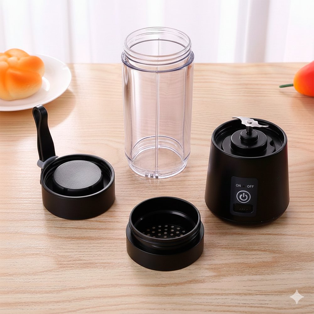 Vaso plástico doble paredcon base en silicona. 4 Aspas en acero inoxidable.Tapa removible. Potenica 40 W. Carga USB con cable incluído. Capadidad 400 ml. De 7.7 x 22.5 cm .