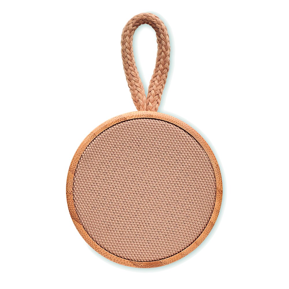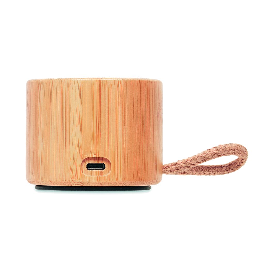 InalÁmbrico con Bluetotth 5.0 . Cuerpode bambú, altavoz y cordón en algodón. Indicador luz led. Batería recargable de 300 mah. Puerto tarjetas sd cable aux usb. Función manos libres. Output: 3w, 5v. Tiempo reproducción aproximado de3h. De 7.1 x 5.4 cm